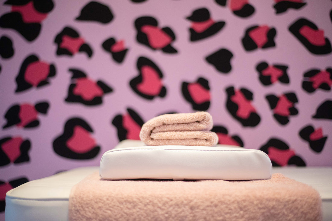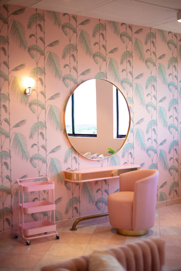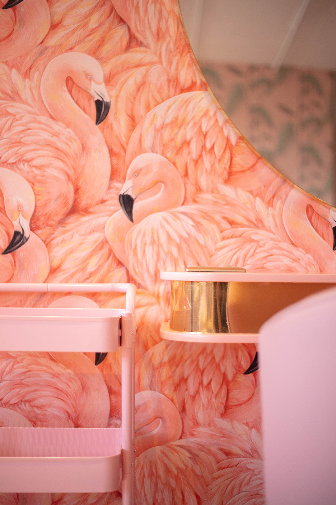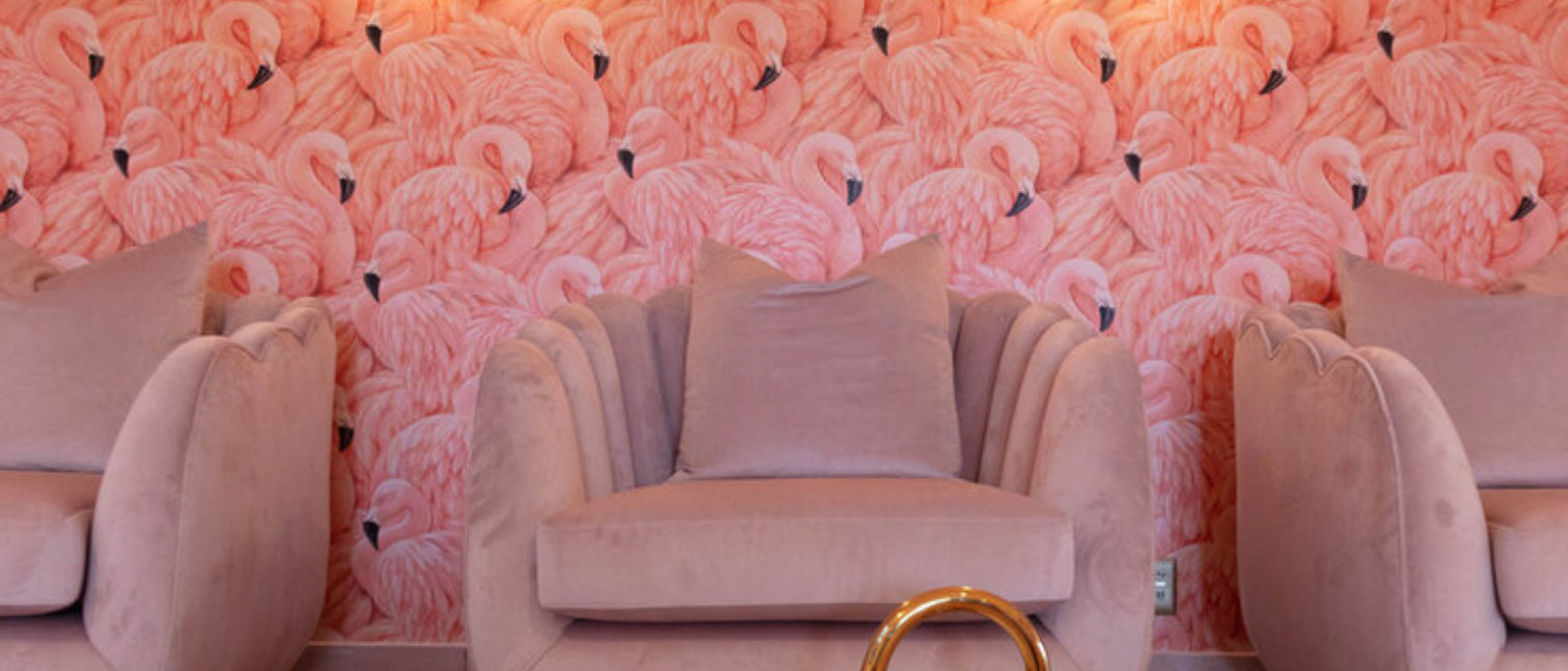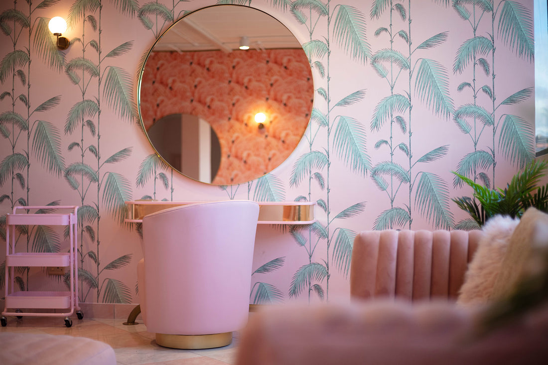 The use of rounded corners on the counters and furniture combined with beautiful spherical mirrors accentuated the idea of the feminine form. Plush velvet for the upholstery highlighted the softness of the feathery flamingo wallpaper.