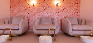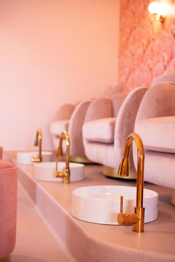 We added touches of gold to bring in some shine and offset the blush tones with hints of opulence. In our pedicure station, the bespoke oyster shell chairs are metaphors for the clients entering as a grain of sand and leaving feeling like a shining pearl.