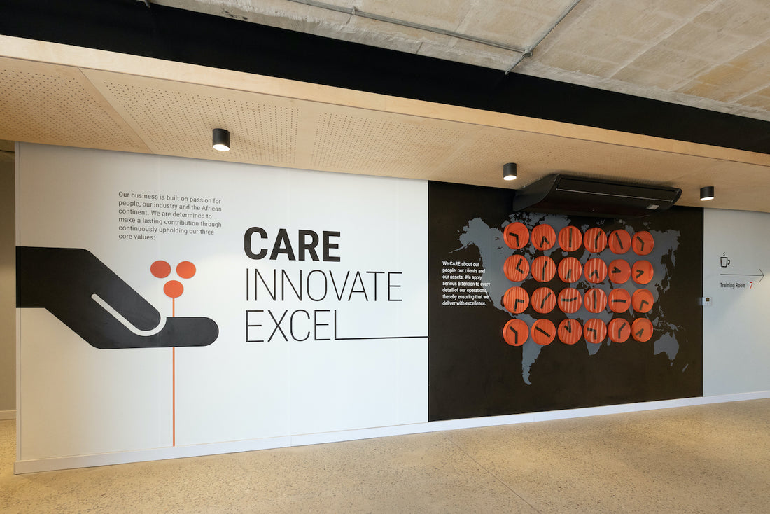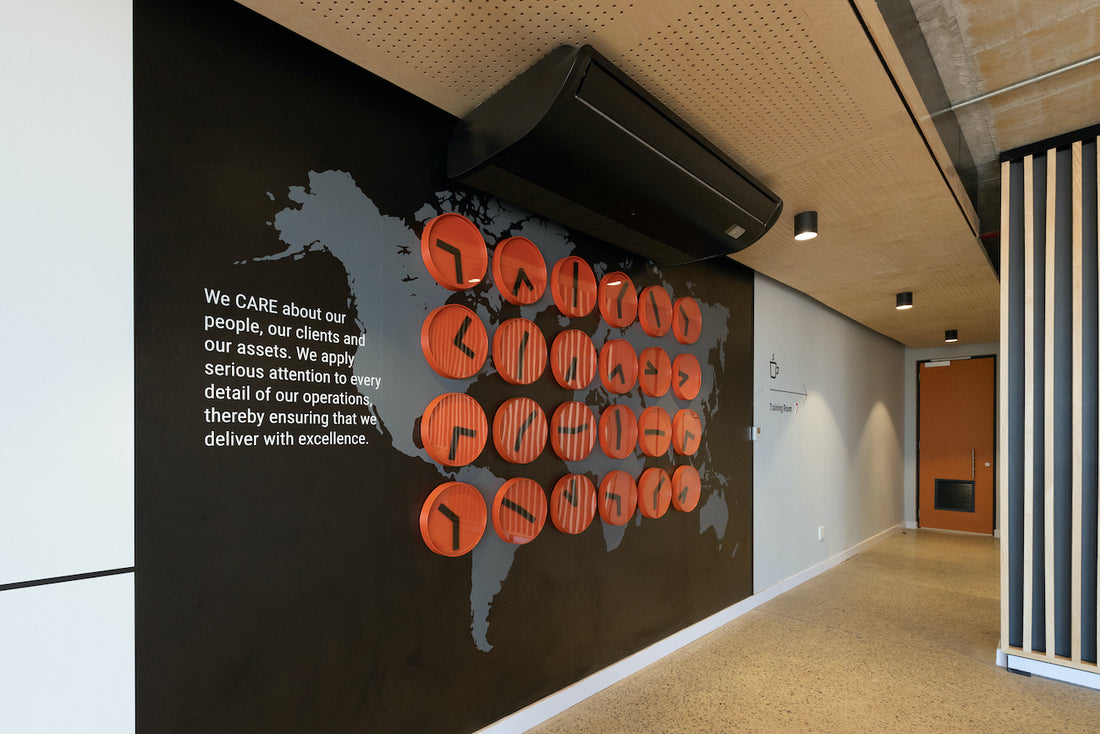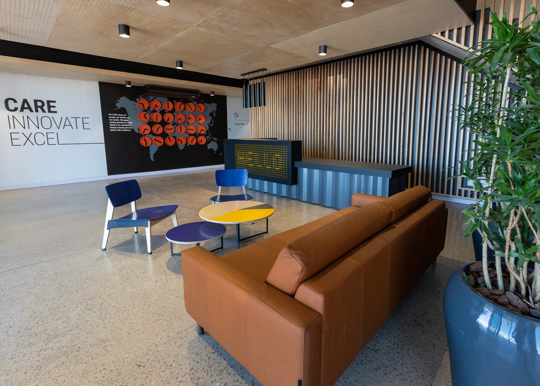 We were tasked with designing the look and feel for the interior components for the office spaces, reception, kitchen and boardroom areas, as well as all the wayfinding and signage. The look and feel takes inspiration from the heart of the business, which is centred around citrus. The colour palette was inspired by the various fruits exported and the deep blue of the ocean, which is a few hundred metres away from the offices.