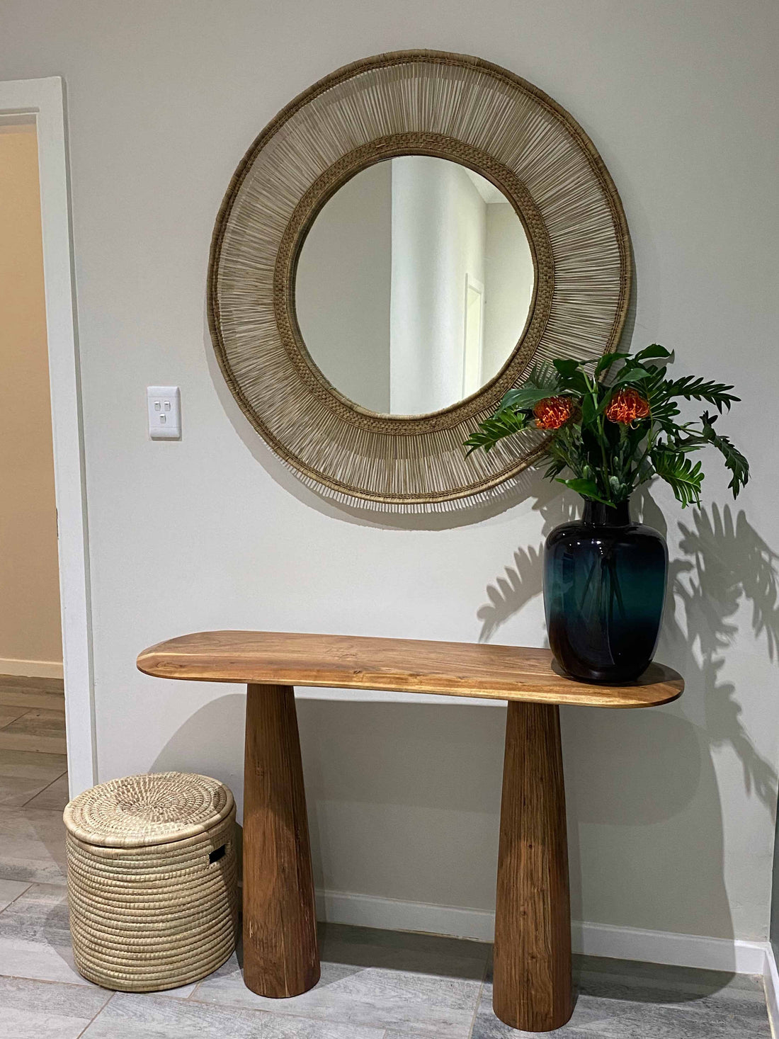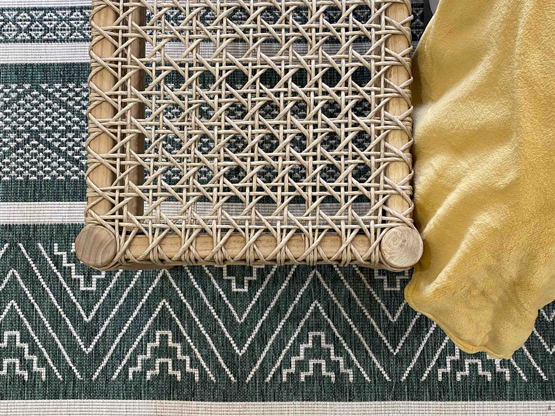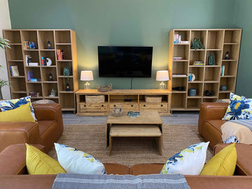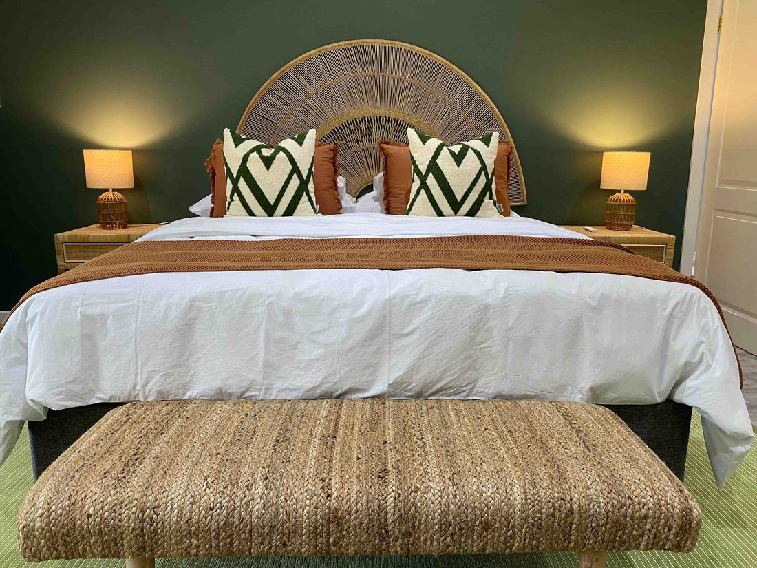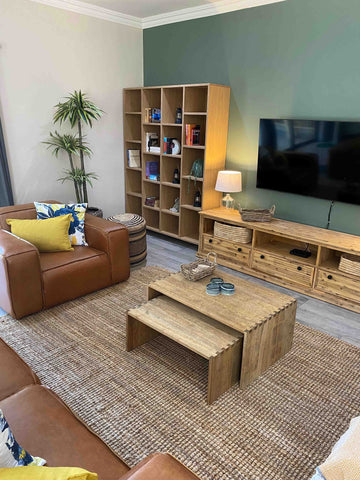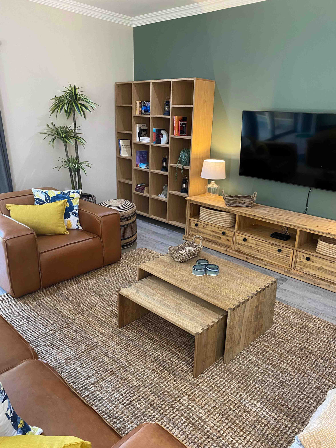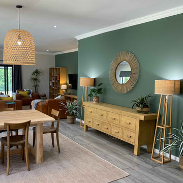 We drew inspiration from the surrounding farmland, choosing to use warm, neutral-coloured furniture with a lot of textured materials. The addition of soft sage green and cornflour yellow feature walls, paired with brighter pops of blue, green and yellow scatter cushions and linens, gave the interior a contemporary look.