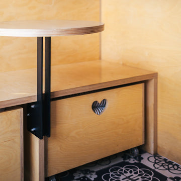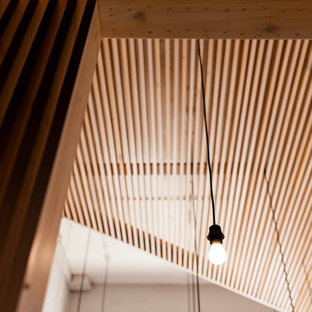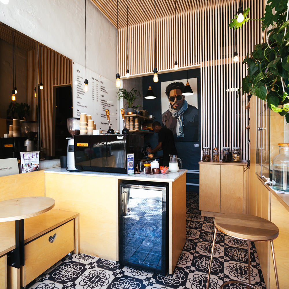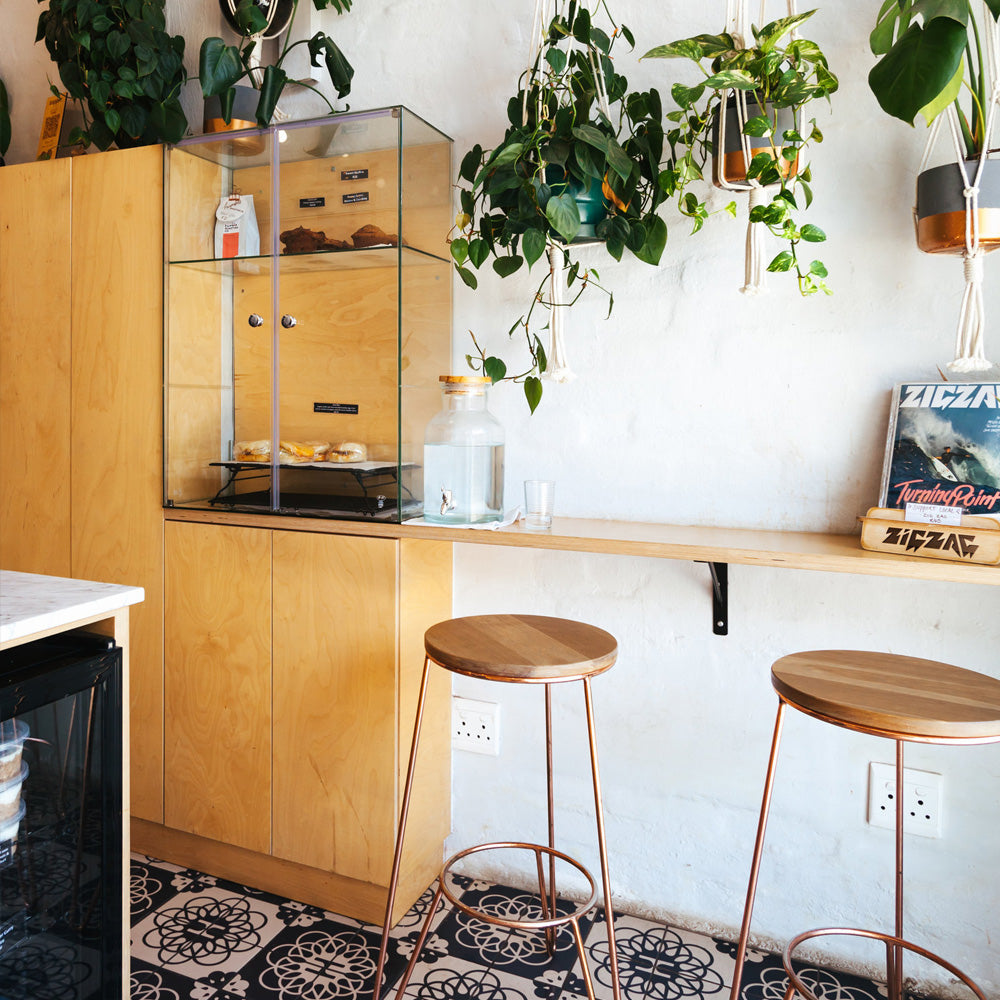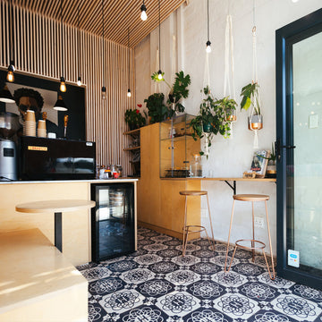 The brief was to create a small hole-in-the-wall coffee bar that could be serviced by one barista. The site was a long and narrow store with incredibly high ceilings and stack-back glass shop fronts. Fitting out the space, we painted the side walls white and the back wall in dark charcoal to draw the eye and customer in. We used slatted timber to divide the back-of-the-house kitchenette from the front-of-the-house coffee bar, as this would allow a line of sight to the front of the house at all times. We extended the slatted timber feature into a bulkhead that celebrated the ceiling height of the space, giving this little shop a wonderful sense of space.