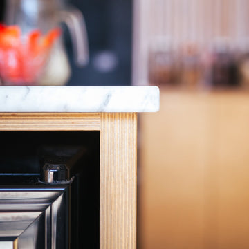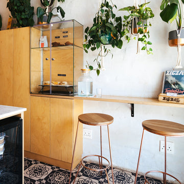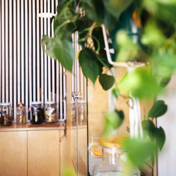 All the shop fitting was finished in birch ply, offset with black appliances and lush green plants to soften the space and bring the idea of a garden inside. We then visually doubled the space by installing a large gold bevelled mirror on one side of the store to reflect all of the natural light and make the shop feel large and spacious.