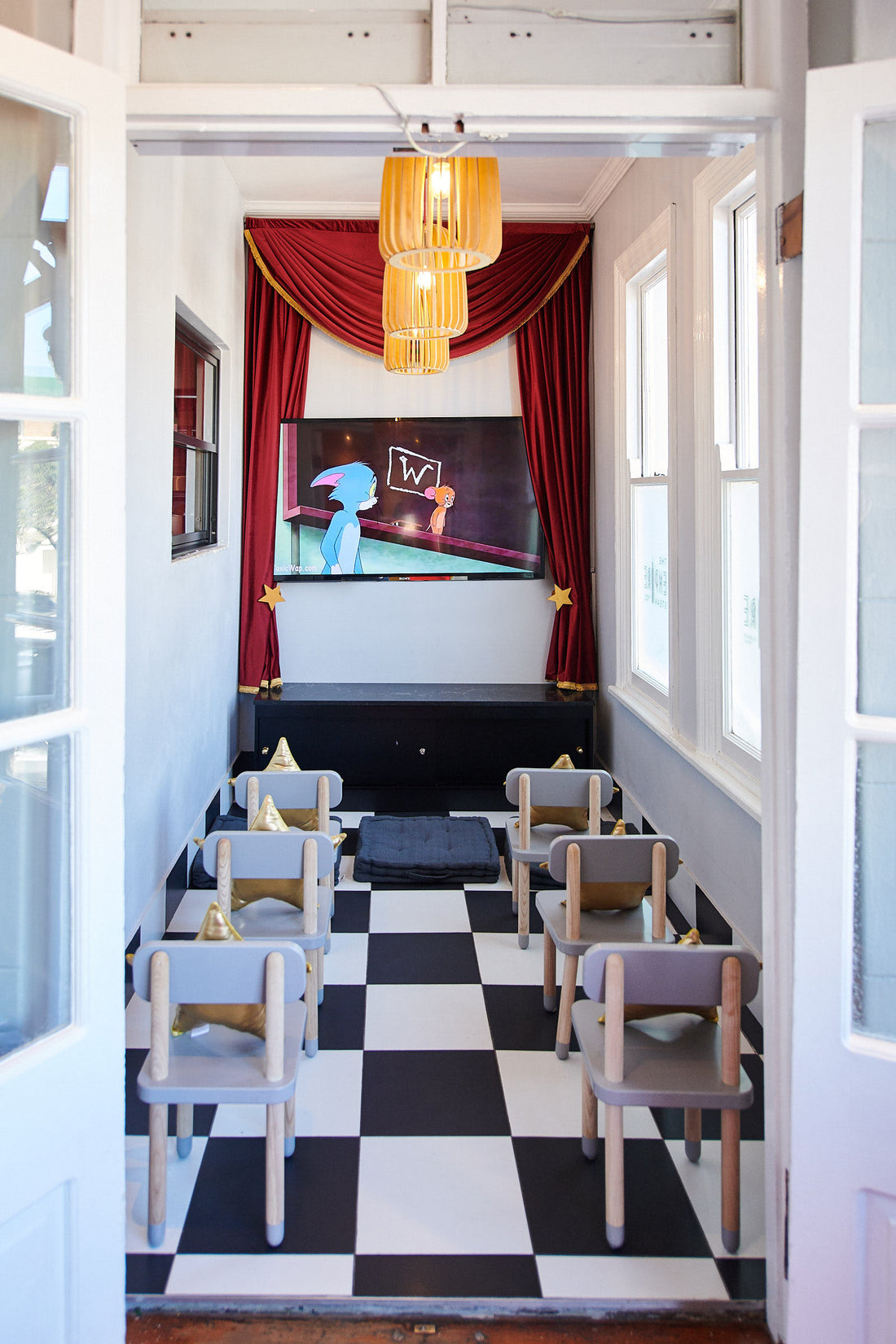 For the kids' play area, we parked a NYC school bus on the side patio and fitted it with a full obstacle course, climbing wall and monkey bars.