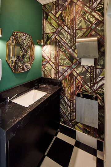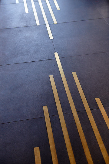 We turned the patio into a courtyard garden with a classic checkerboard tile pattern, inlaid with brass bars emulating the restaurant logo.
