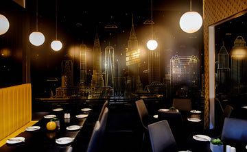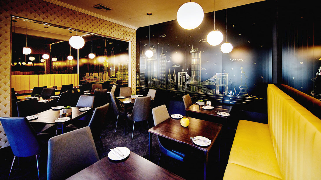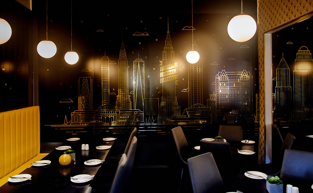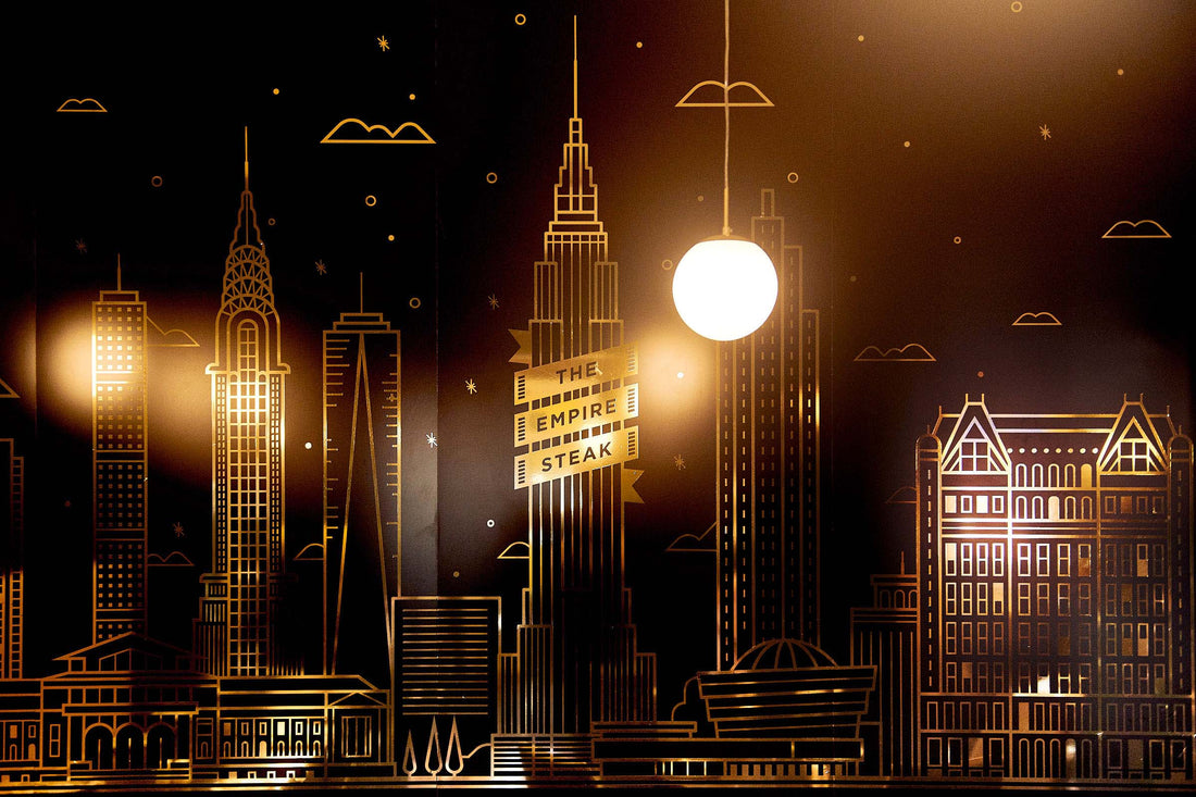 The restaurant interior is finished with exposed raw brick, black steel hanging gardens, mirror panels, and a bespoke NYC skyline in reflective gold vinyl, with the Empire State Building taking centre stage.