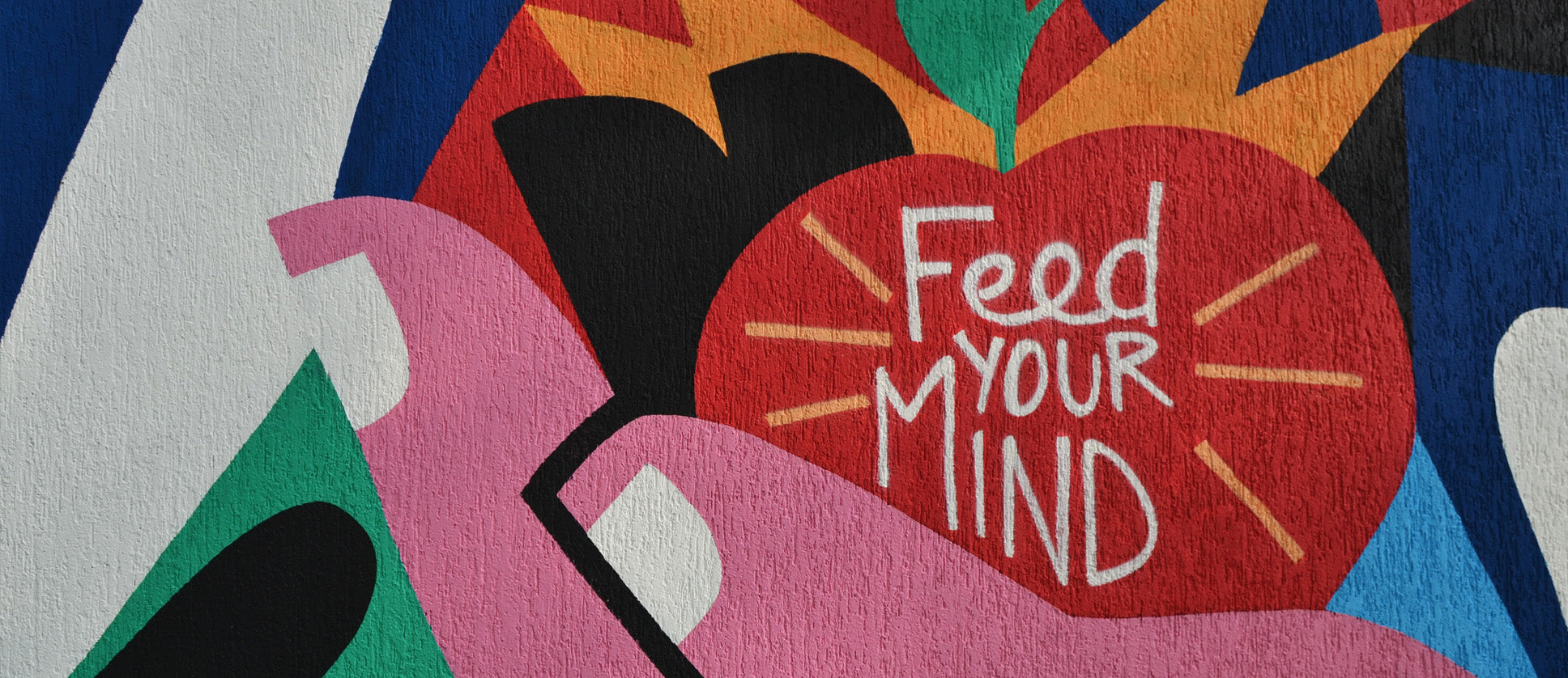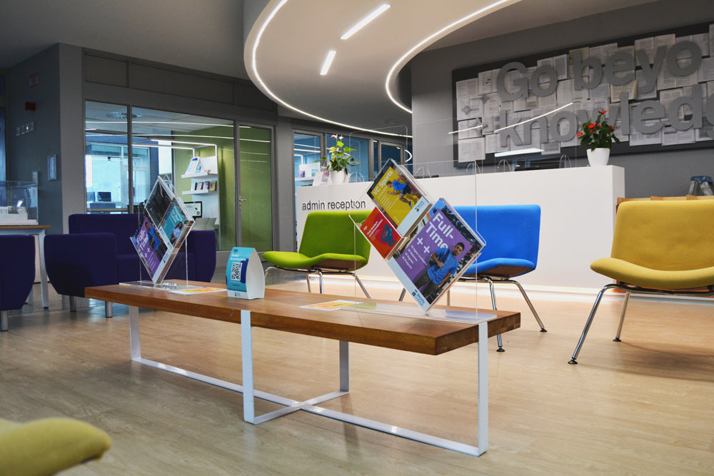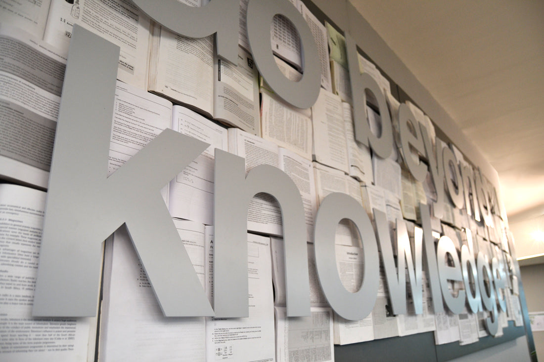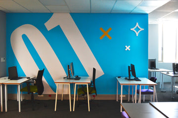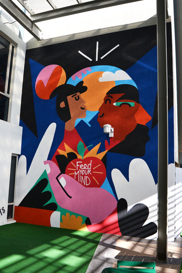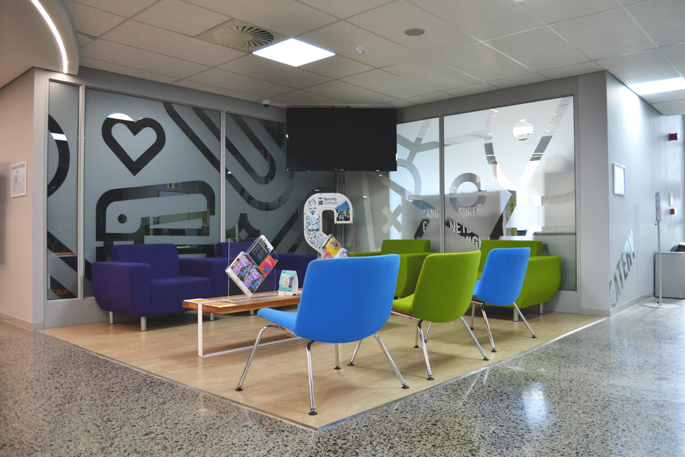 We pushed the envelope out and engaged mural artist Russell Abrahams (Yay-Abe) to create a double-story hand-painted mural in the student eatery courtyard, included bold graphic wallpapers in the study areas, and had some fun in the stairwells by including oversized typography and bright colours to bring the circulation stairwells to life.