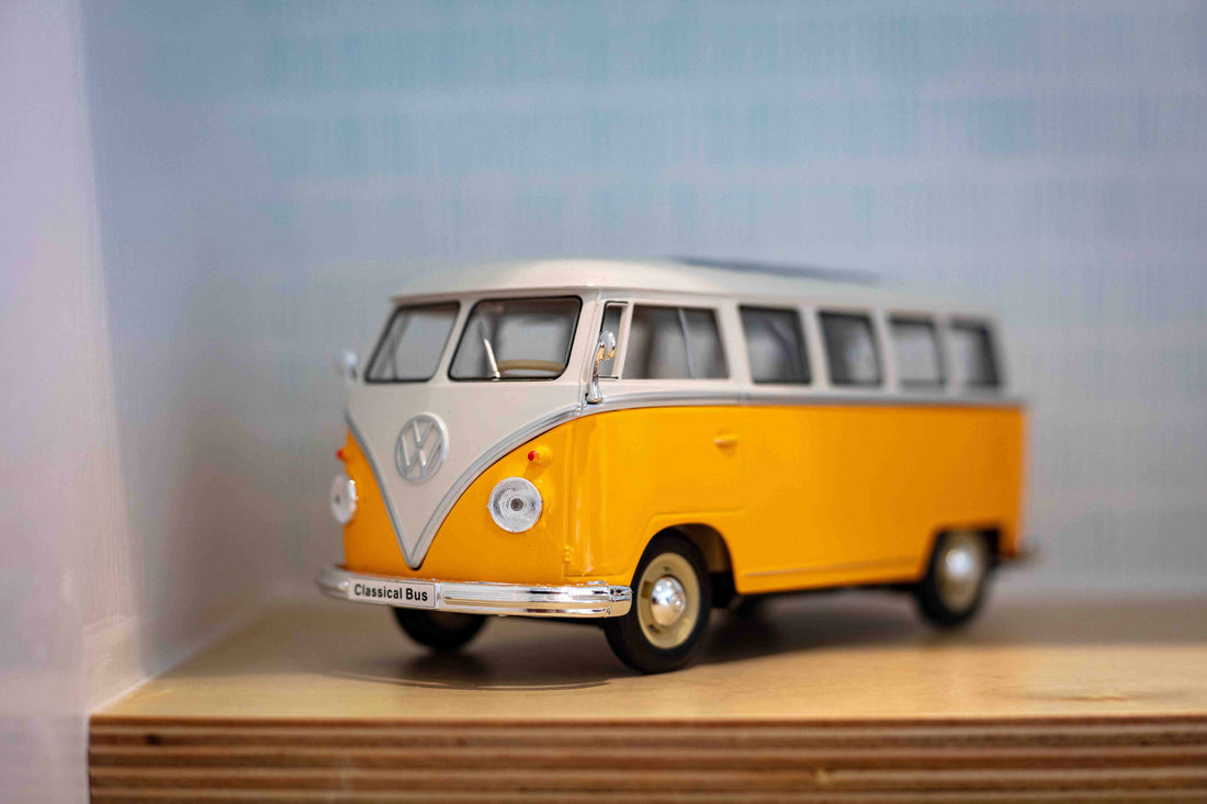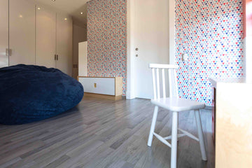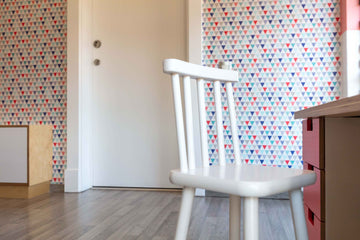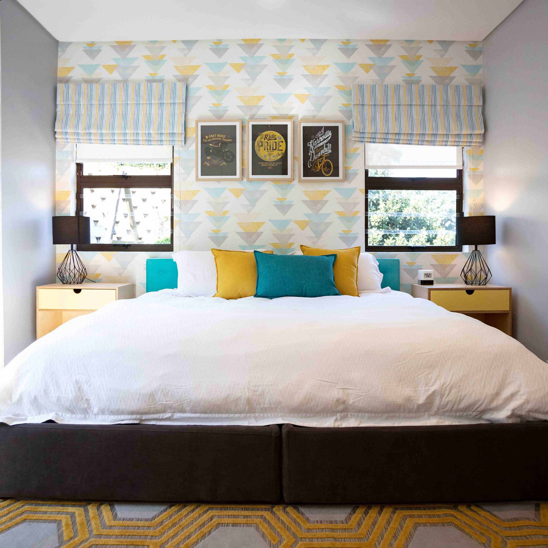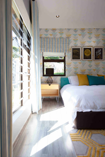 The twins' room was finished with a combination of soft yellows and blues with pops of turquoise. Their love of cars came through in a display of vintage model cars set against a subtle wallpaper backdrop. A bold geometric rug pulls the room together.