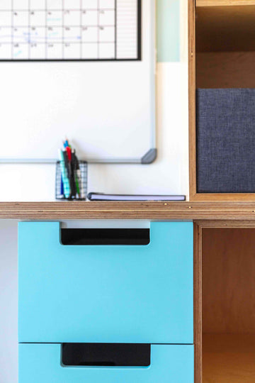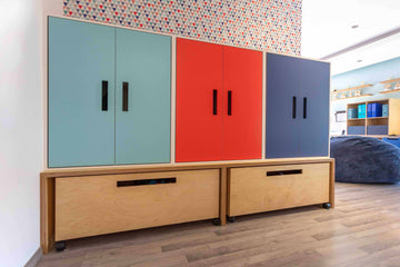 For the study, we created individual colour-coded cupboards for school bags, sports equipment and other essentials that every little boy needs! We built bespoke homework stations for each of the children and tied the room together with a massive bean bag for everyone to pile onto while watching TV or playing games.