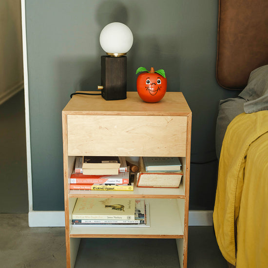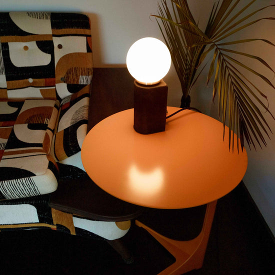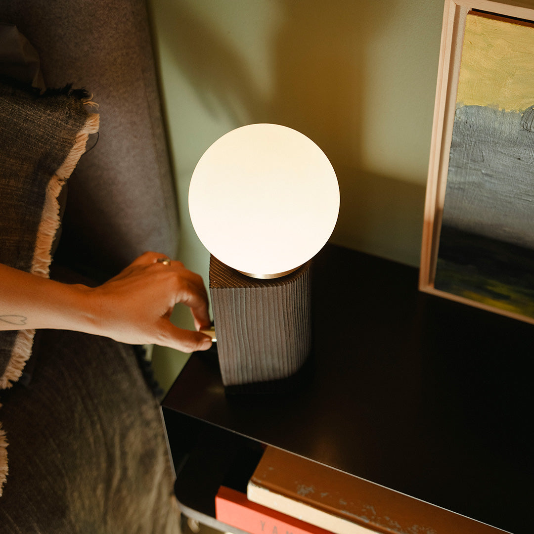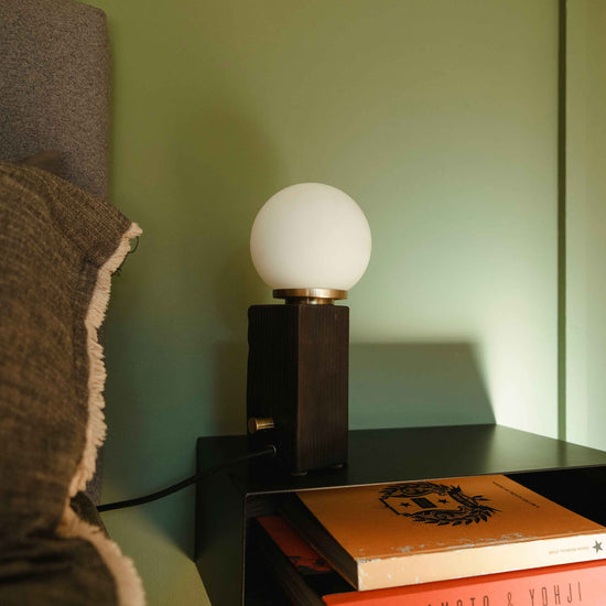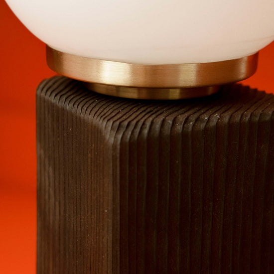 The Kiko Lamp is hand carved from solid timber and then burnt in the Japanese style of shou sugi ban, highlighting the natural texture and grain. The spun brass fittings and frosted glass contrast each other beautifully. It is a quirky yet sophisticated, little lamp that brings a lot of light to a room. It looks good in formal or casual settings.