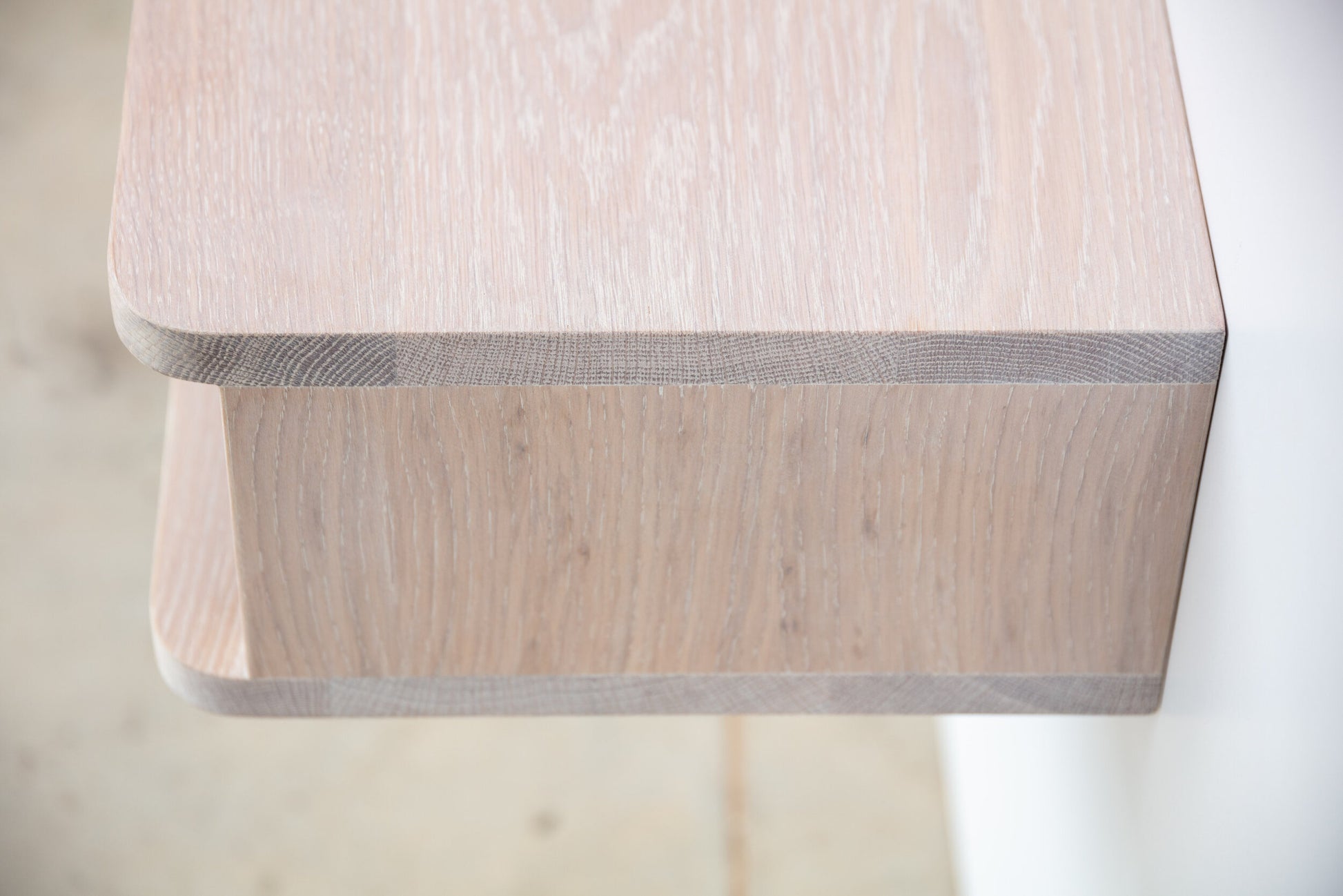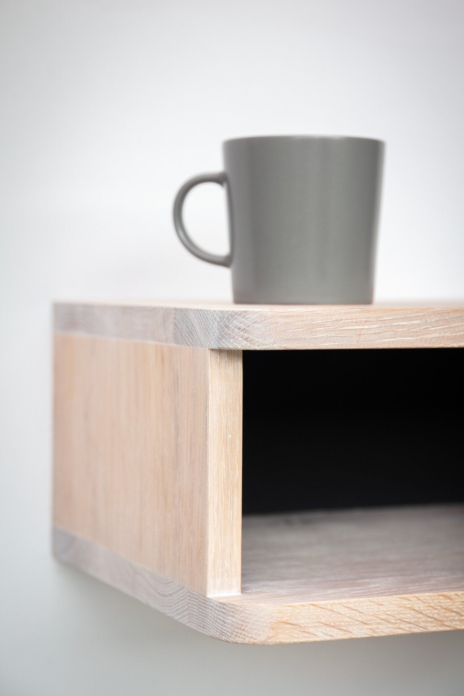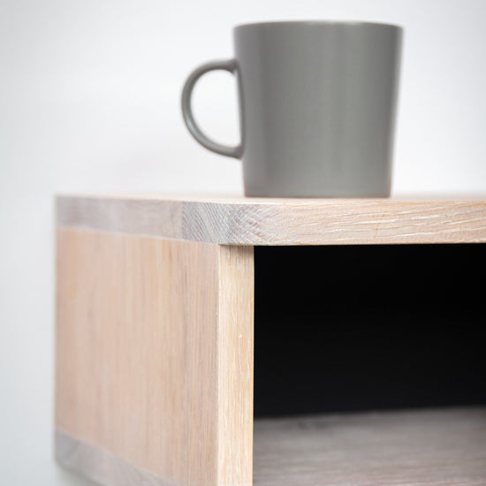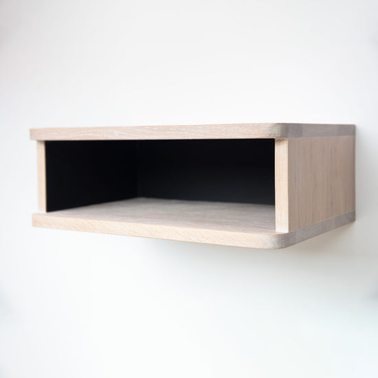 Our floating bedside shelf has a distinct art deco feel with its soft rounded front corners. The top and the bottom edges hanging over the entrance give the unapologettically simple floating box, a beautiful nostalgic feel. It is constructed from solid oak with a choice of white or charcoal monocoat finish. The inside walls have been painted black to draw the eye inwards and create contrast.